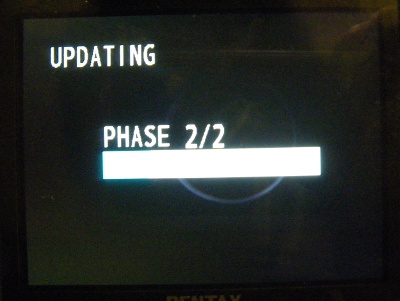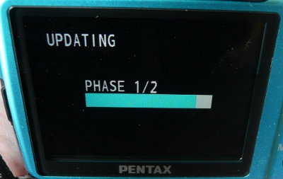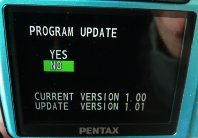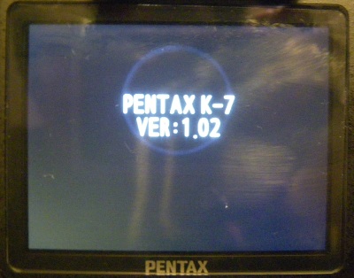 手順は簡単で、ペンタックスからファームウェアをダウンロードしてSDカードにコピー、MENUボタンを押しながら電源を入れるとアップデート画面が出てきます。当然のことですが、途中で電源が切れないように電池は満タンに充電しておきます。(アップデート中に電源が落ちると起動しなくなりメーカー送りとなります)