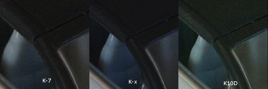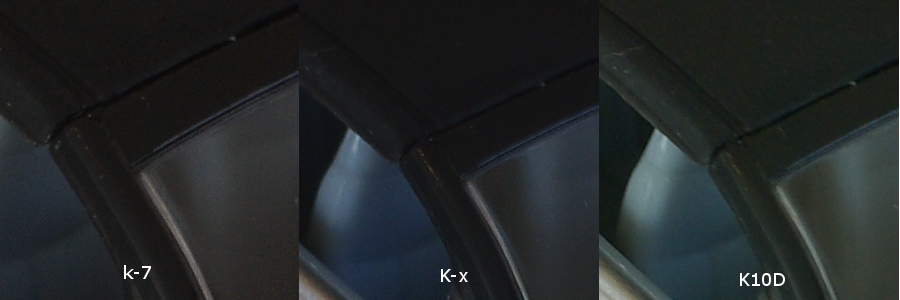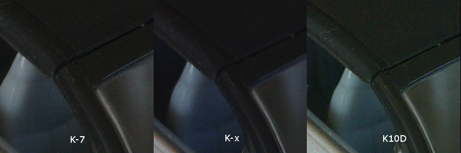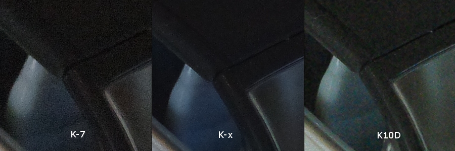 等倍にして部分的に切り出しました。全機種とも拡張設定などでISO-100からスタートできますが、とりあえずデフォルト下限のISO-200からスタートです。K-xはソリッドなブラックが出ていますが、K-7はそれと比べるとやはりザラザラ感があります。K10Dもソリッド感はないのですが、K-7よりもベタで塗ってるのでザラザラ感はありません。