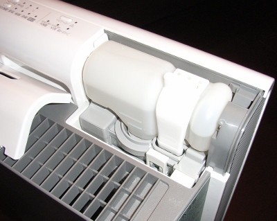 本体のデザインそのものは結構いいと思います。シャープと違って、明かりがうるさくないので夜中でも気になりません。(まあ、シャープもオフにできるんですが)面白いのはファンの吹出しが左右と上の3方向となっていることで、これをうまく使おうと思うとできるだけ壁の中心に置く必要があります。