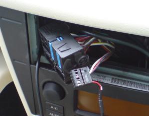 すでにAUX1(外部入力1)が使われています。(ちなみに外部入力は2系統あります)これはおそらくバックソナー用だと思います。なるほど、ステレオで入力されていれば音でも方向がわかるわけです。仕方ないのでAUX2に入力端子をつなげることにしましょう。端子はコネクタ組み立て前の状態で梱包されているので、同梱されているコネクタは使わずに既存のコネクタにピンを差し込みます。