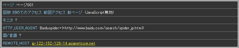 最近ようやく作り始めた倉庫の方のアクセス履歴を久しぶりに確認してみると(そもそも今まで空っぽでアクセスあるわけないから確認すらしていない・・・)1件だけ変わったお客さんを発見。なんてったってバイドゥですよ、Baidu。それをうちのカミさんに言うと、「おおー、珍しい」という業界人以外からは絶対に帰ってこない返事が来ました。