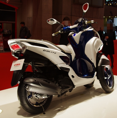 フロントが2輪ですが、トライクと違いちゃんと倒すことができるようです。後ろからみるとまるで普通のスクーターですね。これちょっと欲しいかも。