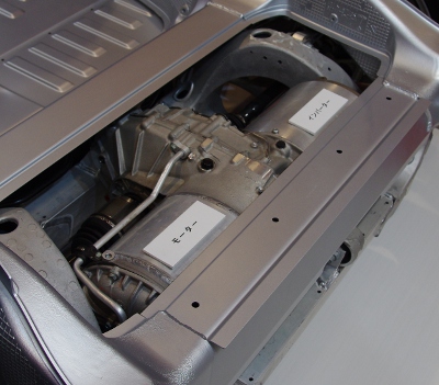 なるほど~、これにボディーを乗っけるだけで走れるんですね~。フロントには電動パワステ、中央のフロアにはバッテリー、そして後部にモーターとインバーターが入ってます。これは恐ろしく低重心な車ですね。
