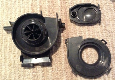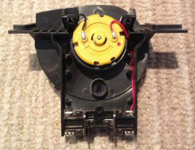 ルンバのダストボックスにはこのように小さなモーターが入っており、このファンで細かいホコリを吸い込んでいるようです。このモーターが壊れて動かなくなるとホコリの吸引力がかなり落ちる模様。