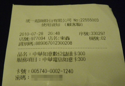 まずはチャージするためのカードを売っているというセブンイレブンに行ってみると・・・どこにもそんなものは見当たりません。仕方ないので現地の人同伴で再度行ってみると、カードはなく基本的にレジからレシートを打ち出すタイプでした。(アメリカでもよくある)店にもよるのかもしれませんが、今回行ったセブンイレブンではSIMを渡すと店員が自分の携帯に入れてチャージしてくれました。が、全ての店でやってくれるとは限らないのでHybrid W-Zero3ではGSMモジュールもあったほうが無難です。