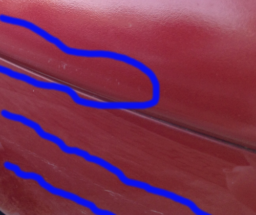 ガラス系コーティング材のおかげか傷は浅く、塗装までは到達していない模様です。コンパウンドで磨けば落ちるかな?