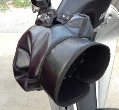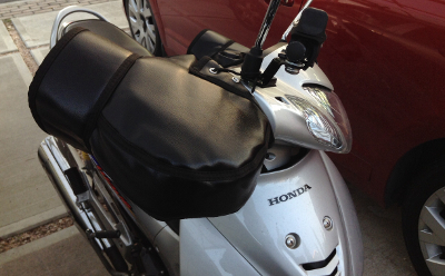 SRVには似合わないよなぁ~と思いつつ、晴れて原付にダウンサイズとなったので試してみることにしました。これまで散々防寒対策やってたんですが、冬用のグローブが一番寒く気温が7度を切ると30分の通勤でも手の感覚がなくなってました・・・お値段1300円とグローブより全然安いですし。