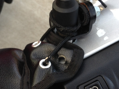 本来はミラーを外して穴に通すみたいですが、めんどくさいのでとりあえず紐でくくるだけ。今のところ全く問題ありません。
