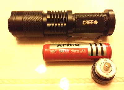 この懐中電灯、最近出回っているかなりハイパワーなタイプでパソコンと同じ18650サイズのリチウムイオンセルを使います。今回購入したのはシングルセルでレンズのズーム機能付きです。一応防水をうたってますが、バッテリー室を見てもゴムパッキンらしきものはないような・・・CreeのT6というLEDを使っているみたいです。他の機種を見ると明るさ1200ルーメンなんてのもありますが、これは800ルーメンでした。(会議室等で電気を消して使うプロジェクターがだいたい1500~2000ルーメンくらい?)正直どんなもんかわかりませんが、補助灯にはなるでしょう。ダメだったら自転車用ライトとして転用すればいいし。