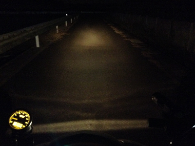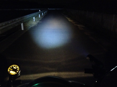 ライトの説明書には5分で熱くなるから素手で持つなと書いてありました(なんて正直な)が、さすがにバイクで走行してると全く熱くなりませんでした。ちなみに連続点灯時間は1時間程度なので、ツーリングで夜間走行を含む場合には予備のバッテリーが欲しいところ。